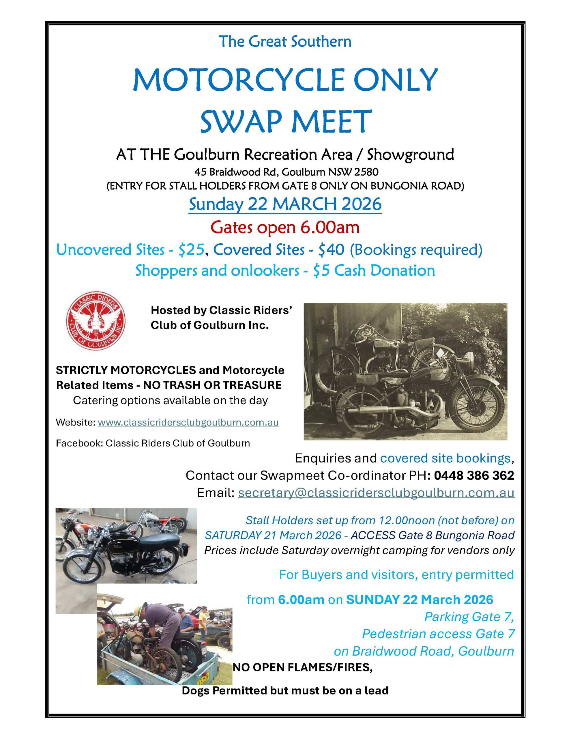 Our Annual Ride for 2025 was a tremendous success and the Classic Riders Club of Goulburn wants you to consider being part of our Annual Ride 2026 Scheduled for the weekend 24th to 25th October 2026. The weekend will commence with a meet and greet BBQ on Friday 23 October, with events rides running over Saturday 25 October and Sunday 26 October. This event offers a wonderful opportunity for visitors to enjoy Goulburn and the local region.